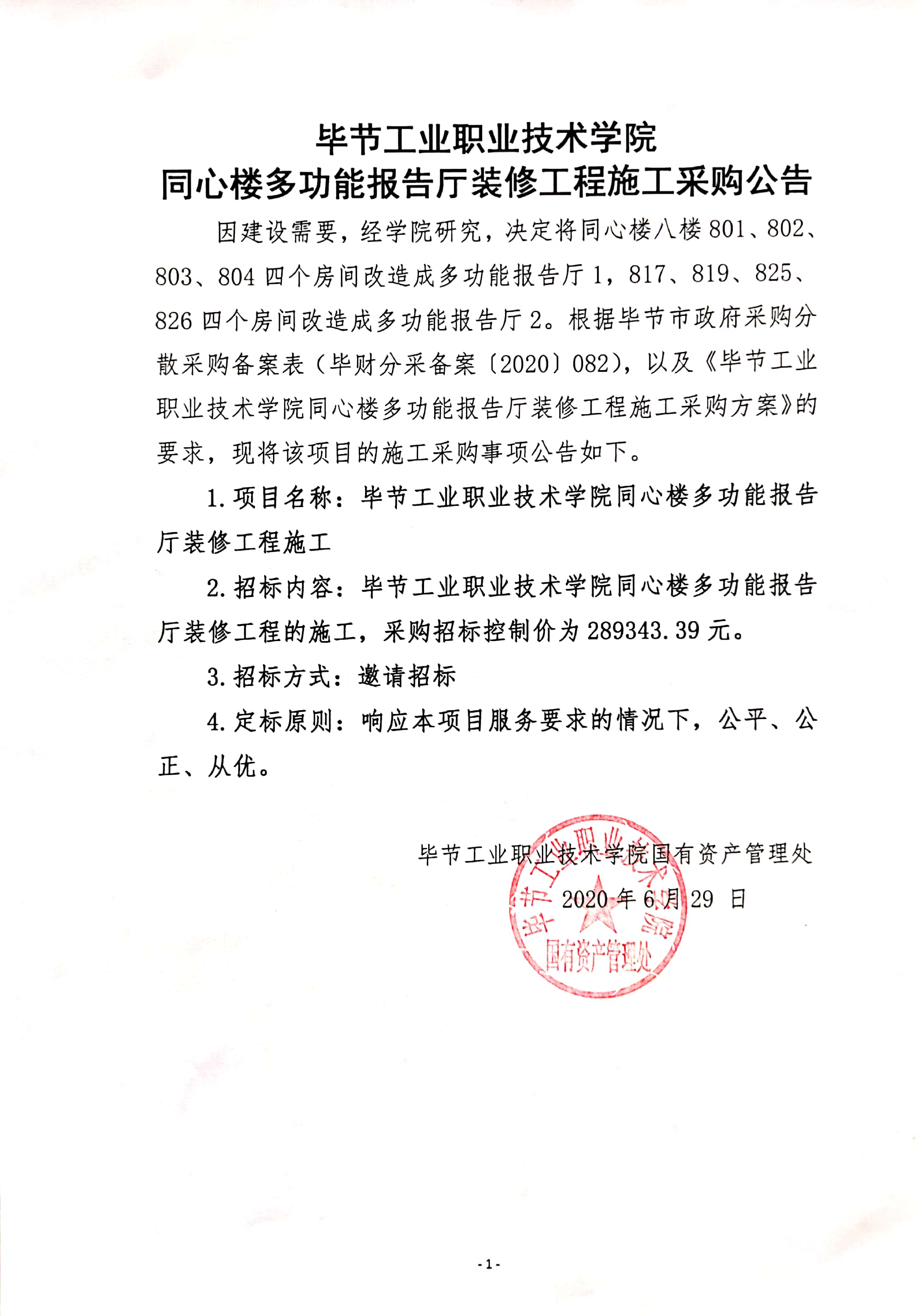 畢節(jié)工業(yè)職業(yè)技術(shù)學(xué)院學(xué)生事務(wù)中心裝修工程施工采購(gòu)公告