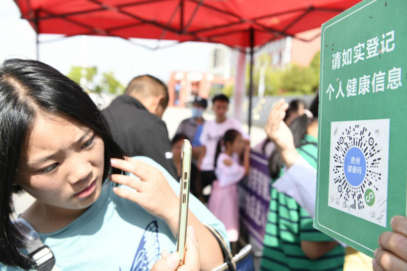 (新生在校門(mén)口掃描健康碼,憑綠碼進(jìn)入學(xué)校)
