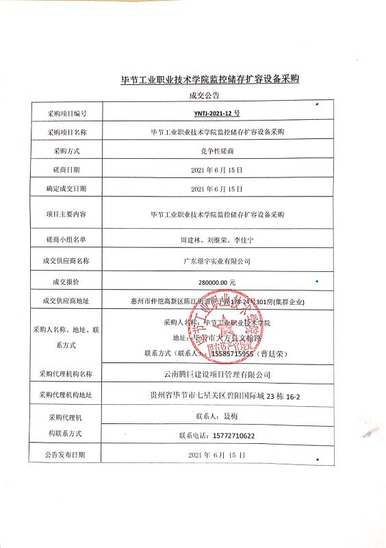 畢節(jié)工業(yè)職業(yè)技術學院監(jiān)控儲存擴容設備采購競爭性磋商中標(成交)結果公告