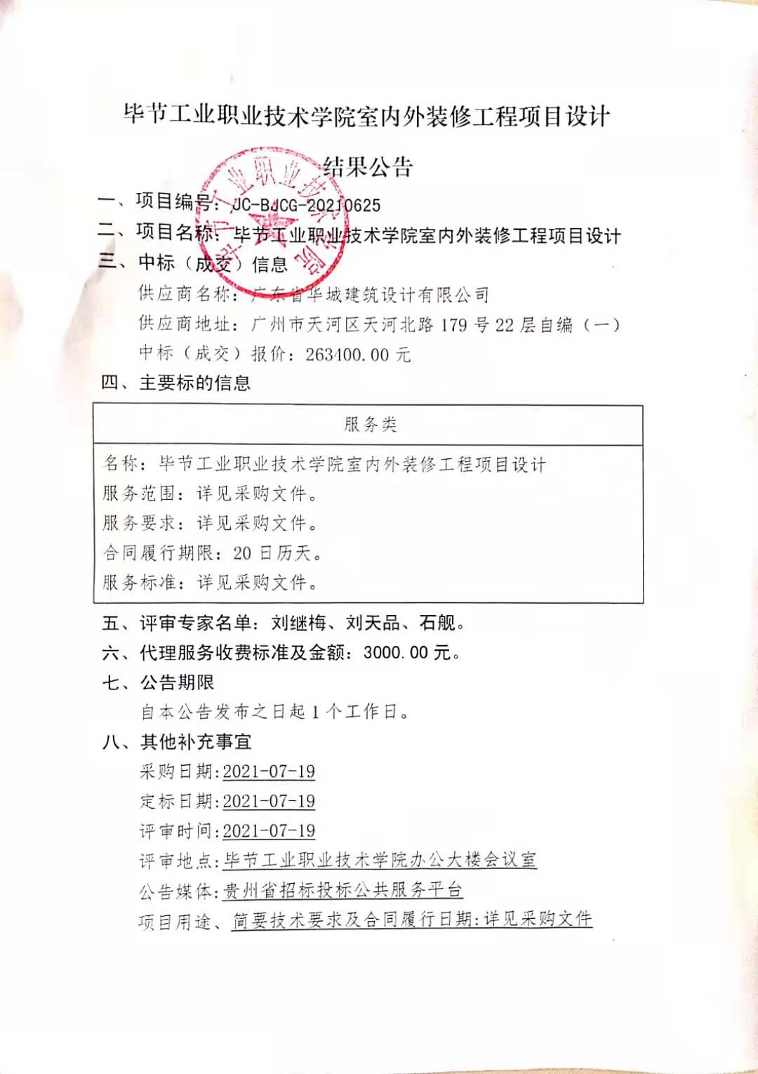 畢節(jié)工業(yè)職業(yè)技術(shù)學院室內(nèi)外裝修工程項目設(shè)計結(jié)果公告