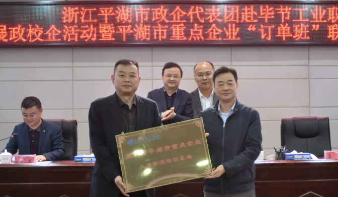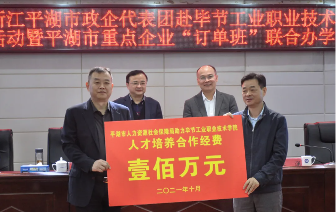 10月19日上午,浙江省平湖市組成政企代表團(tuán)赴畢節(jié)工業(yè)職業(yè)技術(shù)學(xué)院開展了政校企活動暨人才培養(yǎng)合作經(jīng)費(fèi)捐贈、平湖市重點(diǎn)企業(yè)人力資源培訓(xùn)基地授牌儀式及交流座談會。