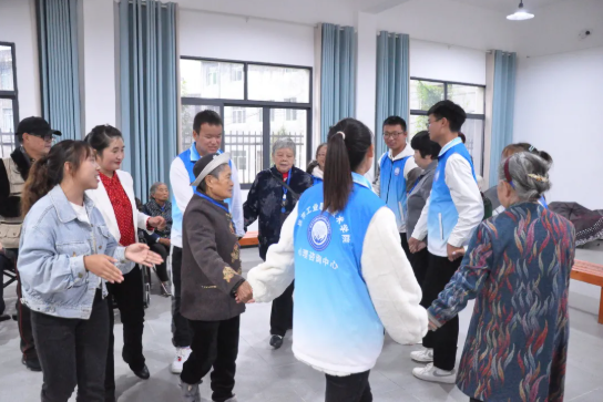 揭牌儀式后,學(xué)院心理咨詢中心周靜、龍錦春、李玉菊三名老師,以及抽調(diào)的“團(tuán)體心理輔導(dǎo)治愈力量"6名學(xué)生同老人們開展了一次團(tuán)體輔導(dǎo)活動(dòng),活動(dòng)專門為老年人設(shè)計(jì),周全的顧慮到老年人的身心狀況,老人們?cè)诨顒?dòng)參與過程中分享了自己的心聲并參與了積極的談話。依托此次活動(dòng),心理咨詢中心的師生以積極心理學(xué)的原理激發(fā)了老人內(nèi)心世界的正能量,以達(dá)到治愈的作用。隨后三位老師分別為有需要的老人提供一對(duì)一的心理輔導(dǎo),聆聽他們的心聲,讓他們回味曾經(jīng)的驕傲,促進(jìn)了老人健康向上的心態(tài),養(yǎng)老中心的老人們紛紛表示度過了一個(gè)愉快而富有意義的重陽節(jié)。