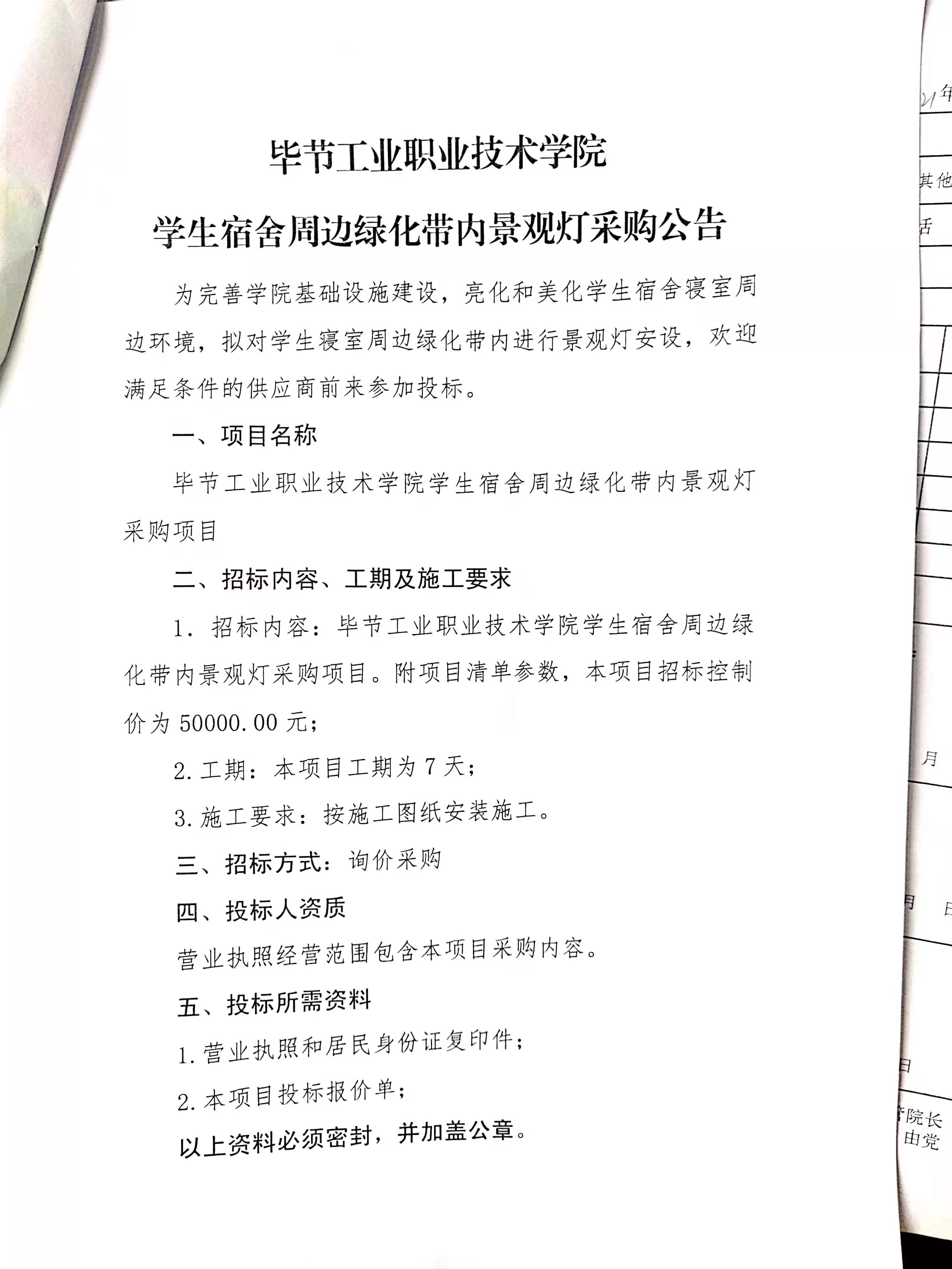 畢節(jié)工業(yè)職業(yè)技術(shù)學院學生宿舍周邊綠化帶內(nèi)景觀燈采購公告