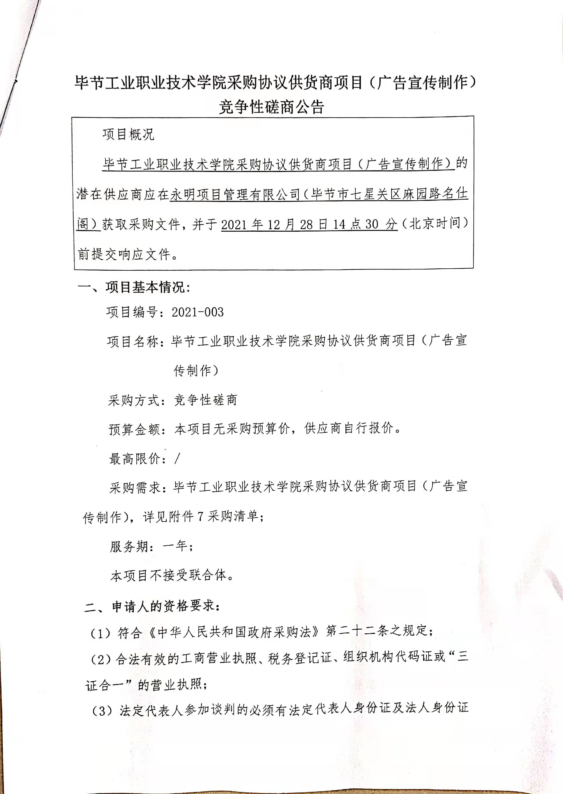 畢節(jié)工業(yè)職業(yè)技術(shù)學(xué)院采購(gòu)協(xié)議供貨商項(xiàng)目(廣告宣傳制作) 競(jìng)爭(zhēng)性磋商公告