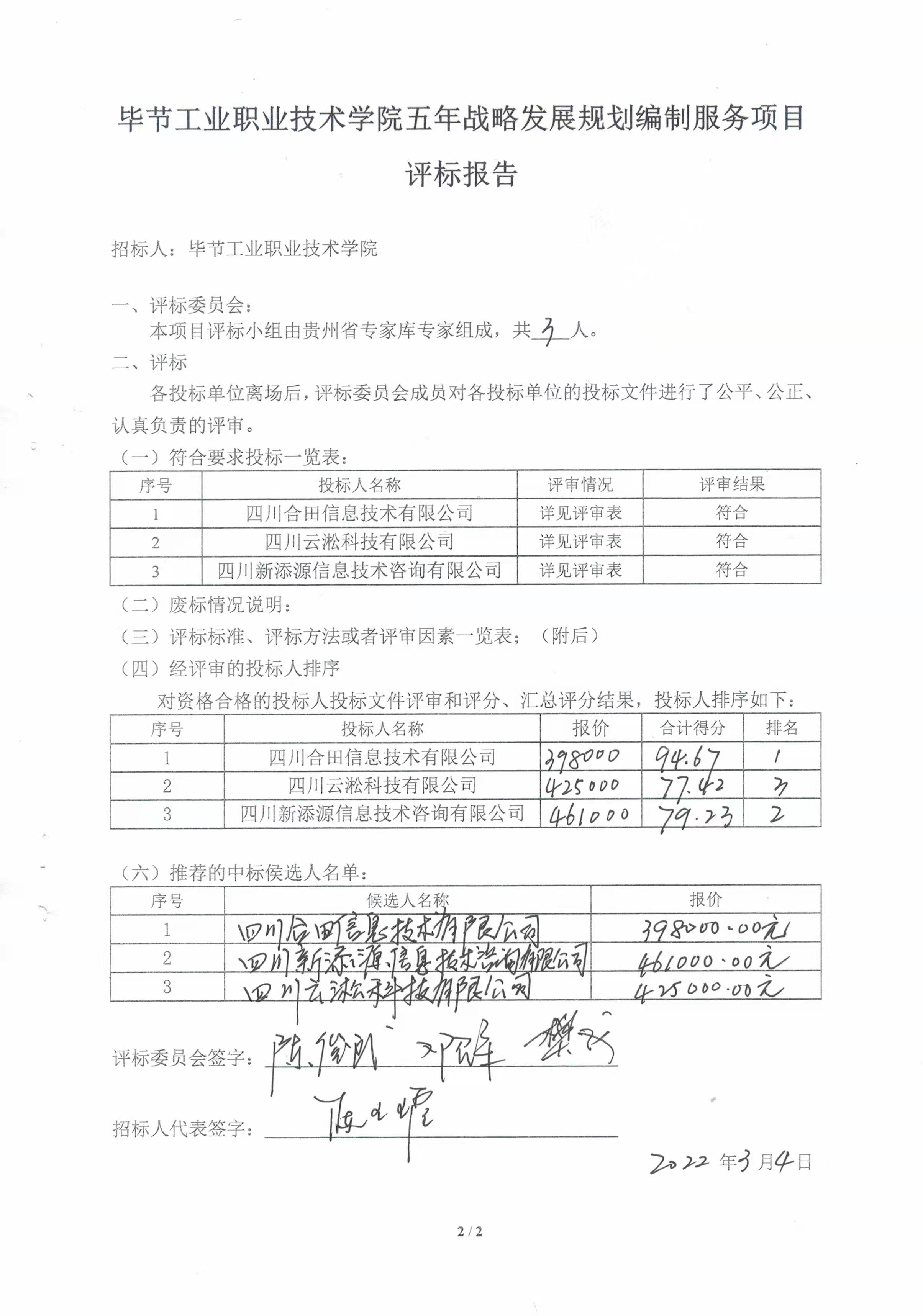 畢節(jié)工業(yè)職業(yè)技術(shù)學院五年戰(zhàn)略發(fā)展規(guī)劃編制服務(wù)項目評標報告