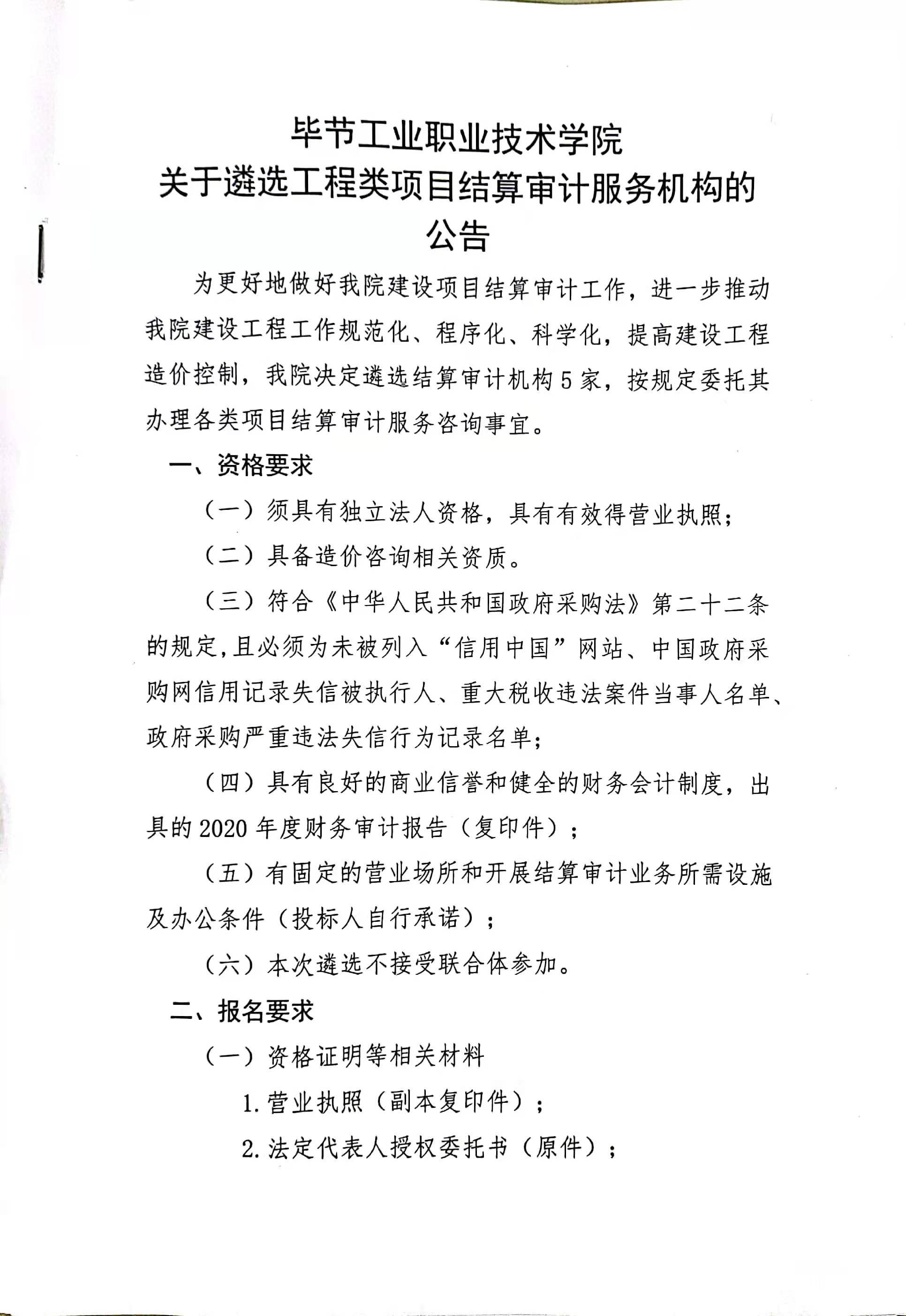 畢節(jié)工業(yè)職業(yè)技術學院關于遴選工程類項目結算審計服務機構的公告