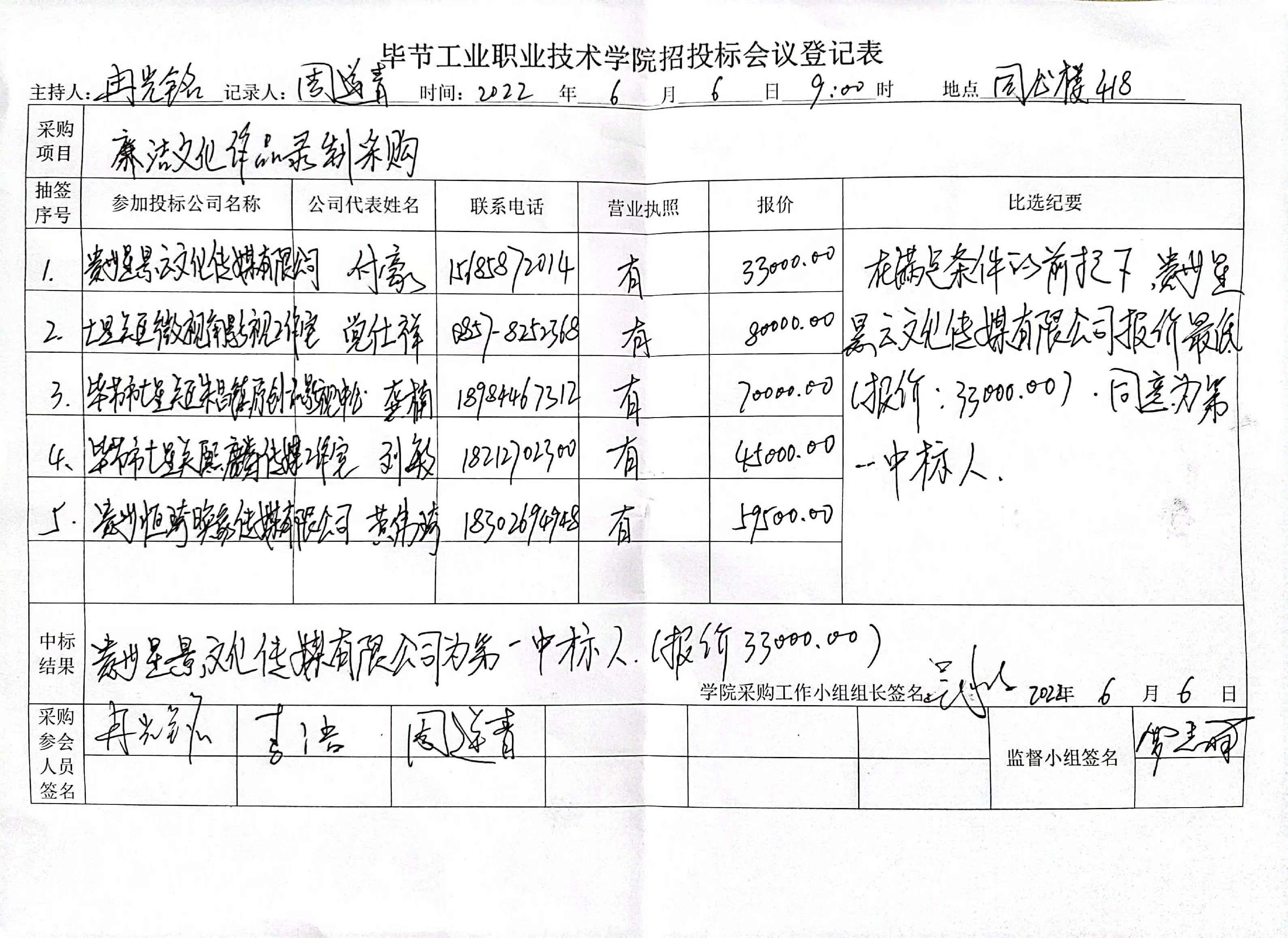 畢節(jié)工業(yè)職業(yè)技術學院 廉潔文化作品錄制采購 招投標中標公告