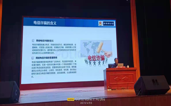 吳警官結(jié)合職業(yè)院校學(xué)生的特點(diǎn),用發(fā)生在學(xué)生身邊的電話詐騙、網(wǎng)絡(luò)詐騙、兼職招聘等熱點(diǎn)案例,采取通俗易懂、喜聞樂(lè)見的方式,對(duì)新型電信詐騙的種類形式、規(guī)律特點(diǎn)以及如何預(yù)防作了詳細(xì)闡述,引導(dǎo)學(xué)生增強(qiáng)防范意識(shí),提高識(shí)騙防騙能力,確保自身生命財(cái)產(chǎn)安全。隨后,吳警官給全體師生普及禁毒常識(shí),詳細(xì)介紹毒品的種類,講解毒品對(duì)人體和家庭的危害及對(duì)社會(huì)的影響,告誡大家珍愛生命,自覺抵制毒品。最后,吳濤警官針對(duì)職業(yè)院校中部分學(xué)生性格沖動(dòng)、自控能力較弱、法制觀念淡薄的一些不良現(xiàn)象,用發(fā)生在學(xué)生身邊的生動(dòng)案例、深刻的教訓(xùn),警示學(xué)生要遵紀(jì)守法,不要做讓個(gè)人后悔、家庭蒙羞、社會(huì)不安的糊涂事情,教育大家要充分認(rèn)識(shí)尋釁滋事、打架斗毆、盜竊等青少年違法犯罪的嚴(yán)重危害,正確處理好各種關(guān)系,充分珍惜大好學(xué)習(xí)時(shí)光,學(xué)有所成,以真才實(shí)學(xué)匯報(bào)父母和社會(huì)。