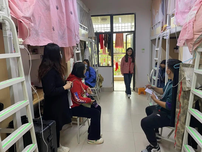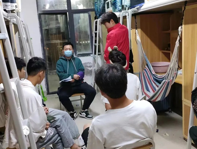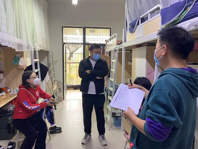 我系聶濤、史曉嵐、何應(yīng)垚、蒙光國等多名老師第一時(shí)間趕赴學(xué)院防控一線,組織開展疫情靜默期間各項(xiàng)工作,并帶領(lǐng)我系志愿者同學(xué)用心用情服務(wù)學(xué)生、關(guān)愛學(xué)生。在靜默期間走訪學(xué)生寢室,關(guān)注重點(diǎn)特殊人群、排查心理健康異常情況等,并做好相應(yīng)記錄。