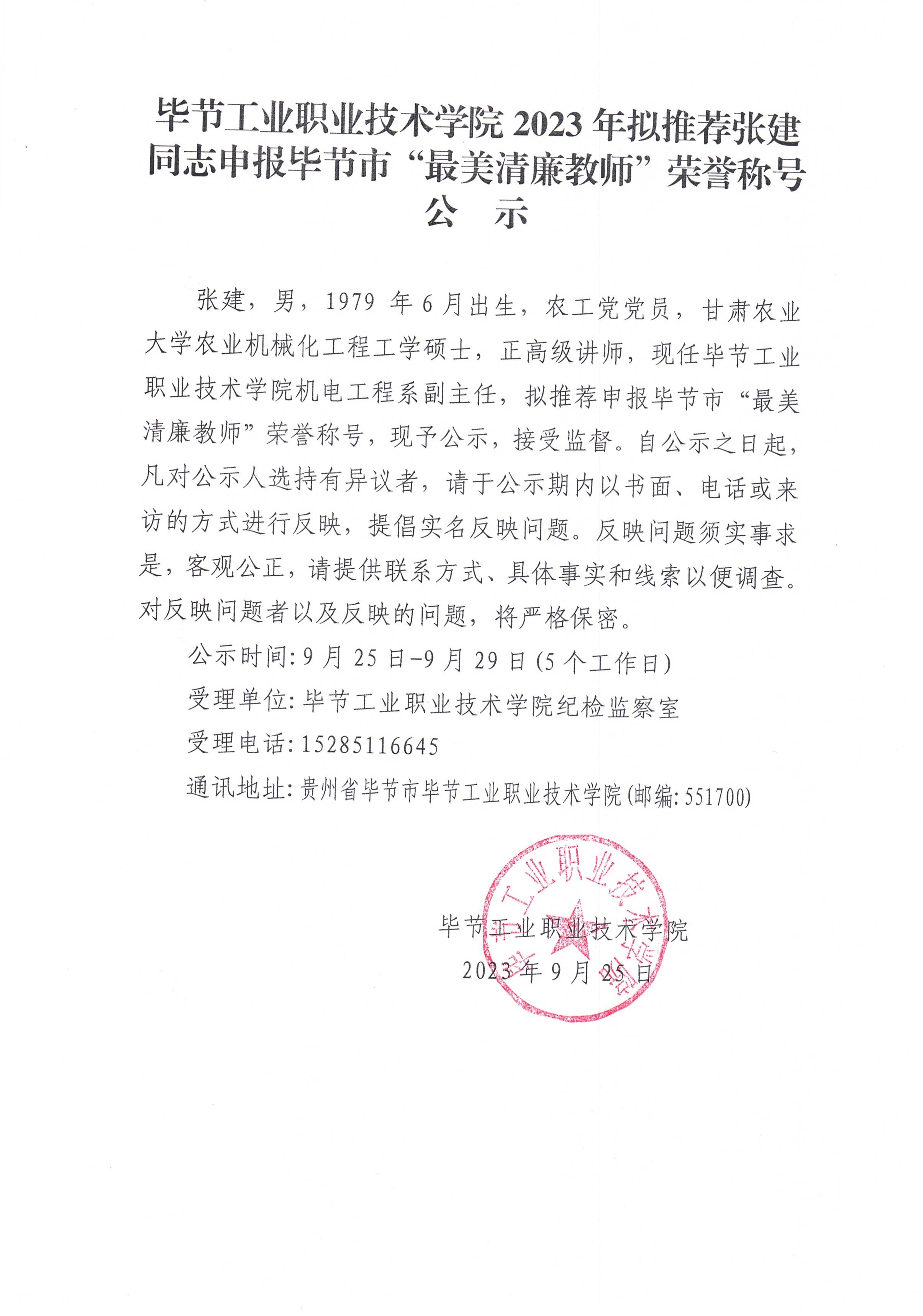 畢節(jié)工業(yè)職業(yè)技術(shù)學(xué)院2023年擬推薦張建同志申報畢節(jié)市“最美清廉教師”榮譽(yù)稱號公示