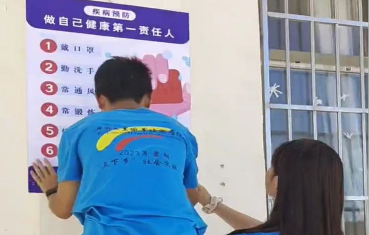 圖為實(shí)踐隊(duì)員張貼健康海報(bào)