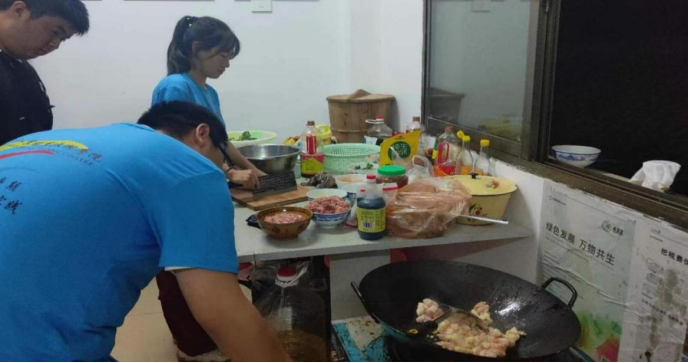 在沙灣村村委的極力支持下,實(shí)踐團(tuán)隊(duì)打地鋪、四支團(tuán)隊(duì)輪流進(jìn)行外出采買(mǎi)物資,做飯。