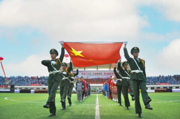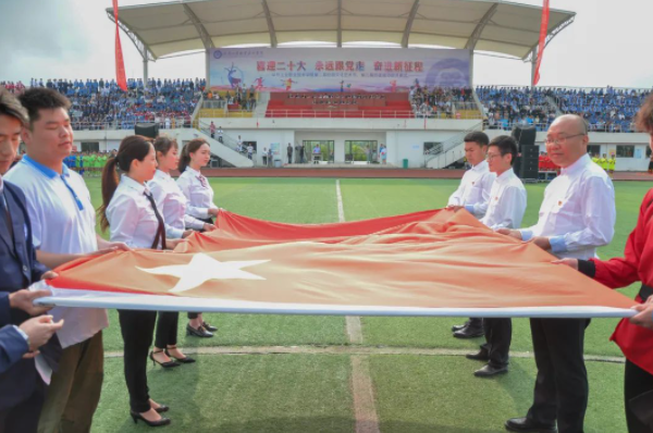 隨著《歌唱祖國》的樂曲響起,開幕式正式開始,學(xué)院代表教師和學(xué)生手手傳遞著五星紅旗,交到國旗護衛(wèi)隊手中,這是一種傳承,更是一份責(zé)任,一份擔(dān)當(dāng)。緊接著,雄壯的國歌響起,鮮艷的五星紅旗升起在田徑場上空。