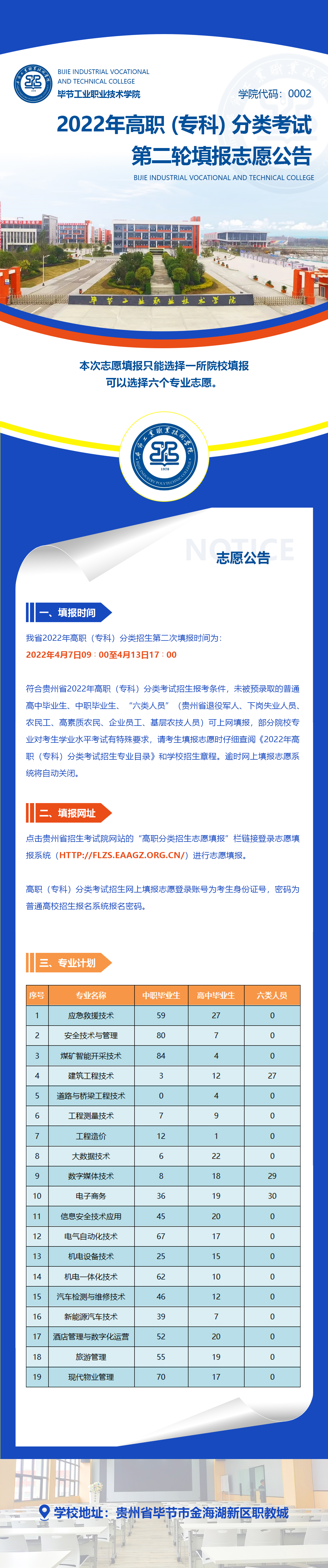 畢節(jié)工業(yè)職業(yè)技術(shù)學(xué)院2022年高職(??疲┓诸惪荚嚨诙喬顖?bào)志愿公告